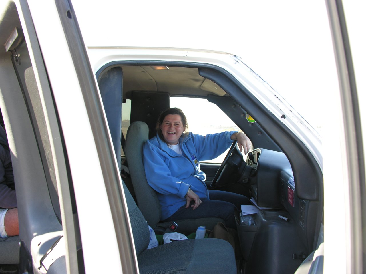 Brigitte au volant du minibus pour nous déposer à nos hôtels respectifs